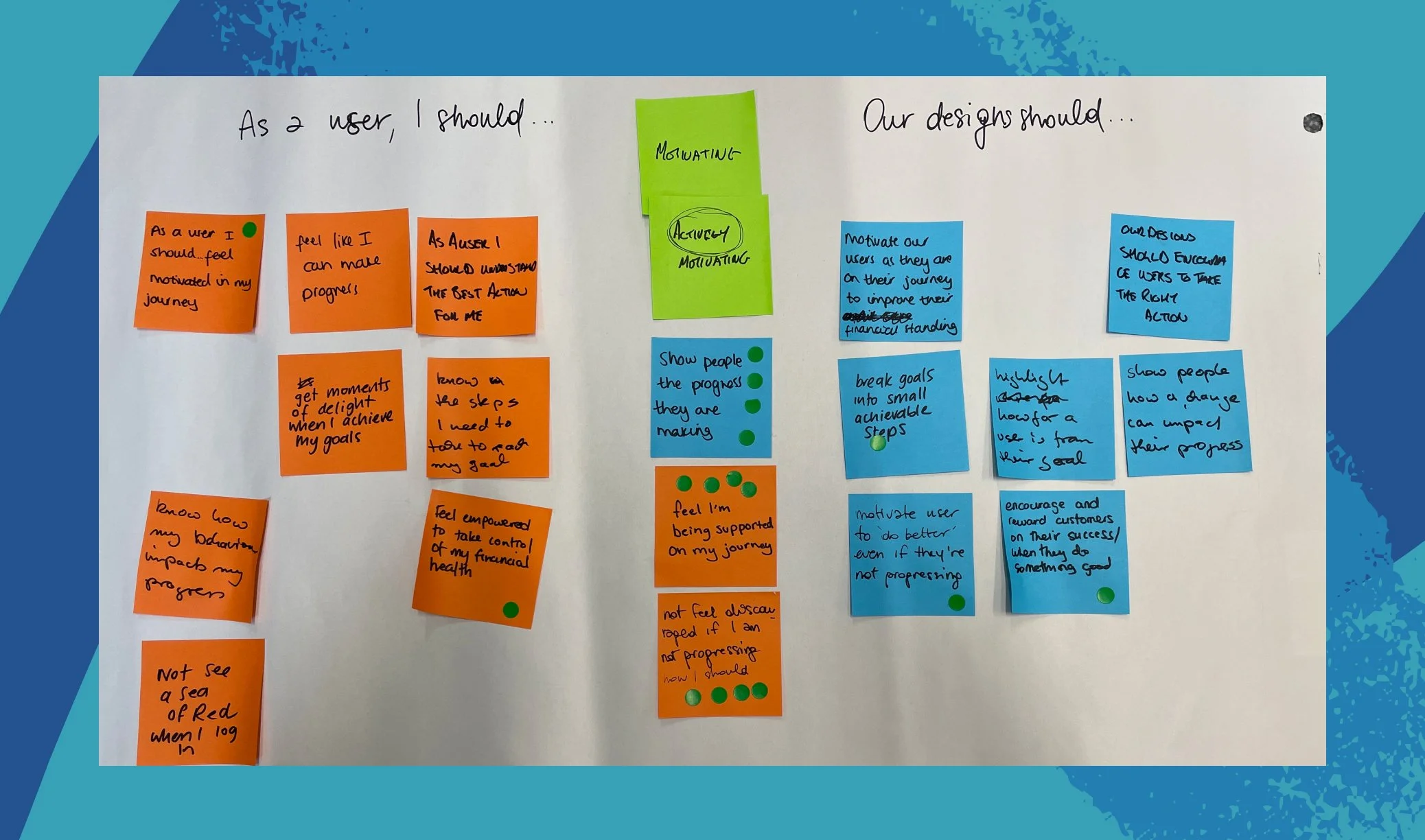 Those descriptive words were grouped into themes and we chose one word from each group that we felt best described where we wanted to be as a product. Through a dot voting exercise (of course 🤓) we chose 5 themes to take forward into the create stage.